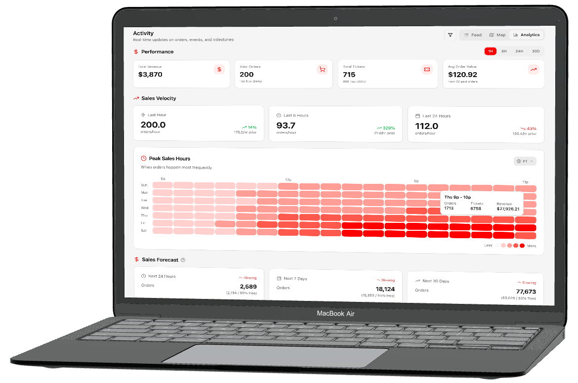 Go beyond the numbers. Sizzle's analytics dashboard breaks down revenue, ticket velocity, peak selling hours, and trend forecasts, all in one place.