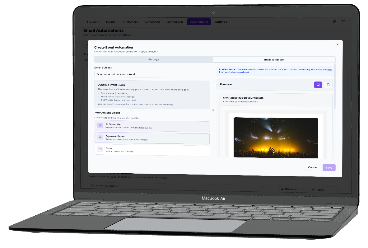 Enable automated message workflows like welcome emails, event reminders or follow ups, notification when their ticket is scanned on-site, and many more.