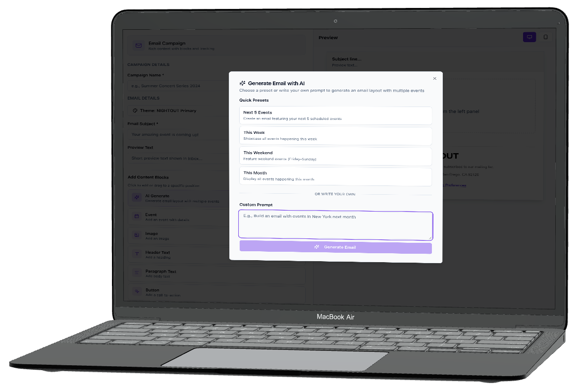 Let AI do the work and automatically create email campaigns from your events in Ticketsauce.