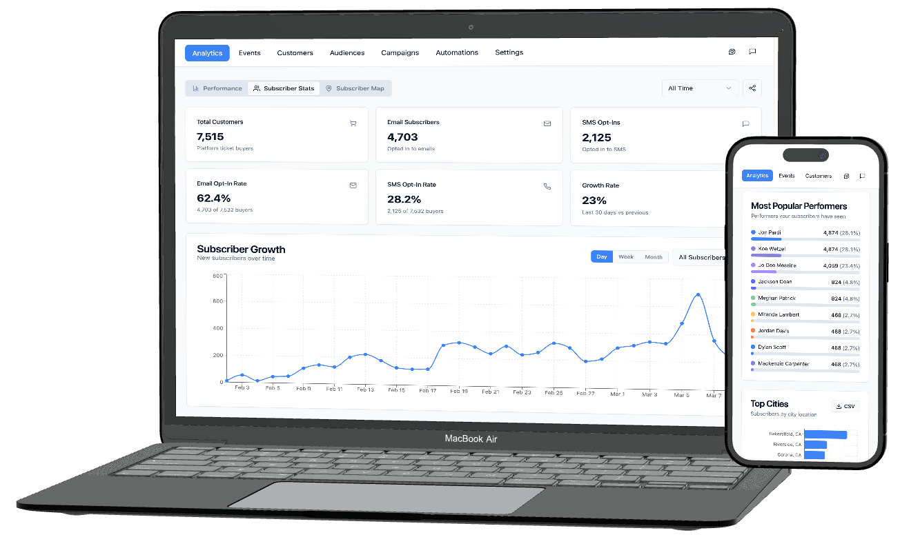Engage automatically syncs and updates your ticket buyers in real time so you never have to manually upload subscribers and their data and preferences are always up to date.